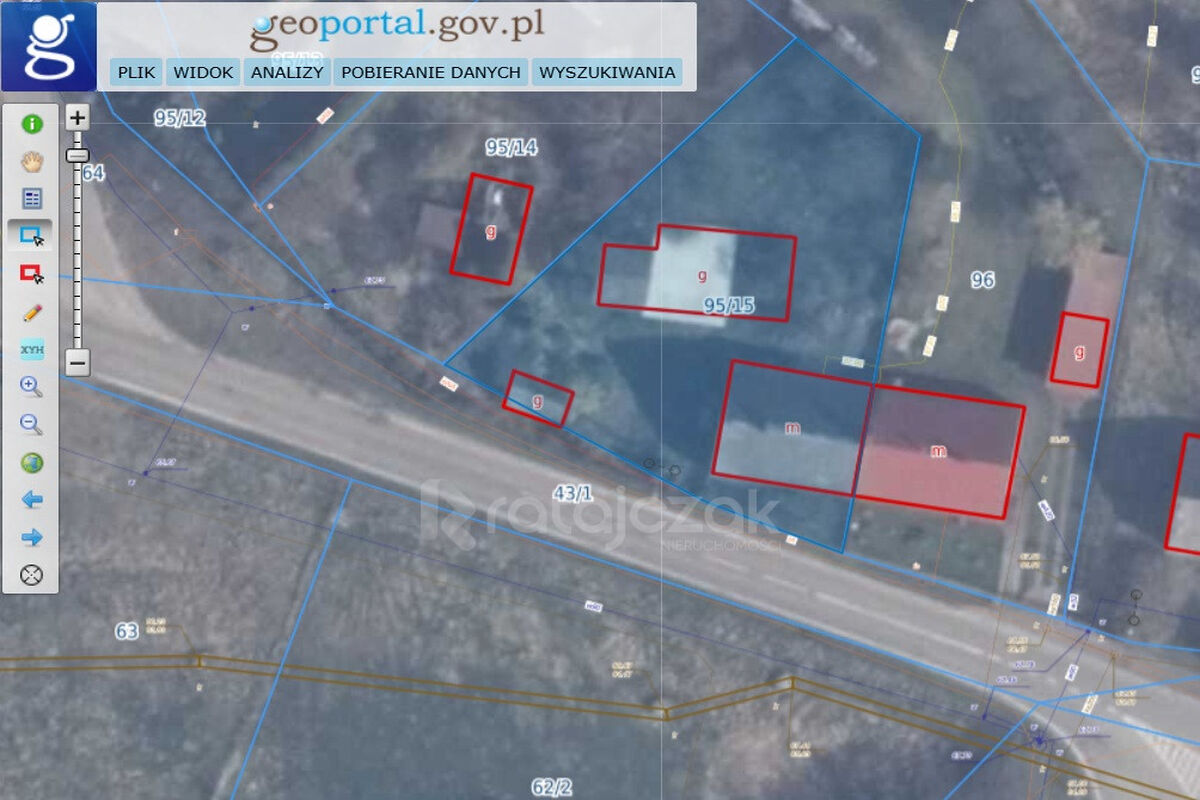 Działka nr 95/15 to teren pochyły, ogrodzony z trzech stron. Nieruchomość jest zagospodarowana licznymi nasadzeniami - rosną na niej drzewa liściaste i iglaste oraz krzewy. Na działce znajduje się budynek w zabudowie bliźniaczej o powierzchni zabudowy 136 m² (przeznaczony do rozbiórki), szopa do wyburzenia oraz garaż wymagający generalnego remontu.