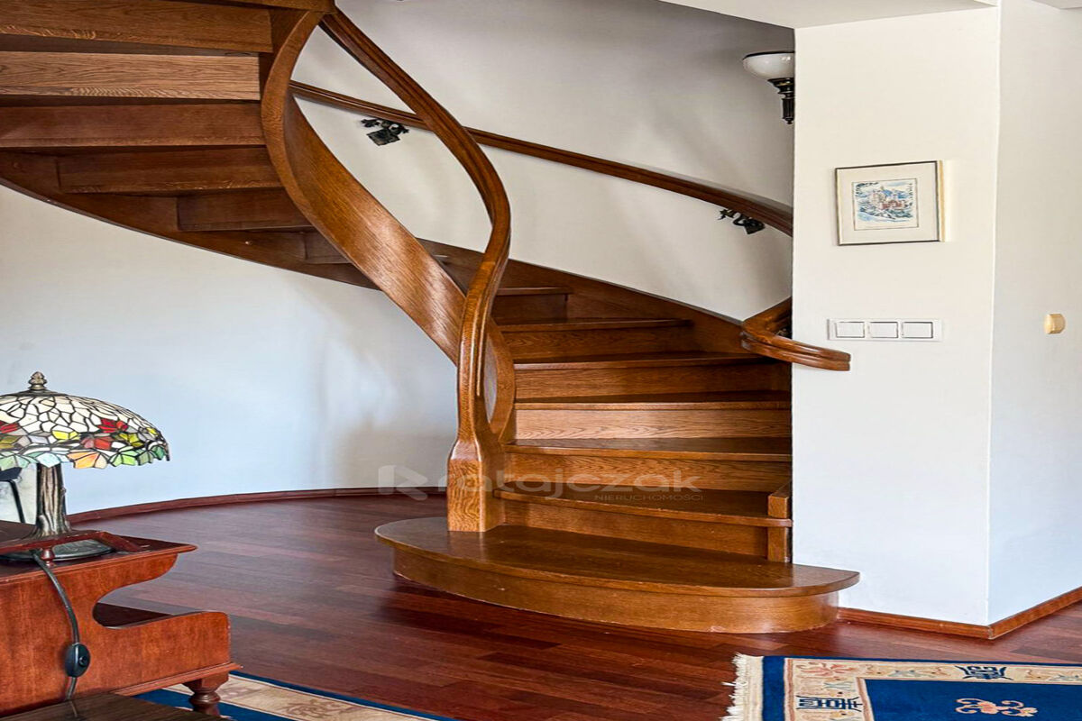 Połączone z parterem dębowymi, spiralnymi schody wykonanymi na zamówienie.