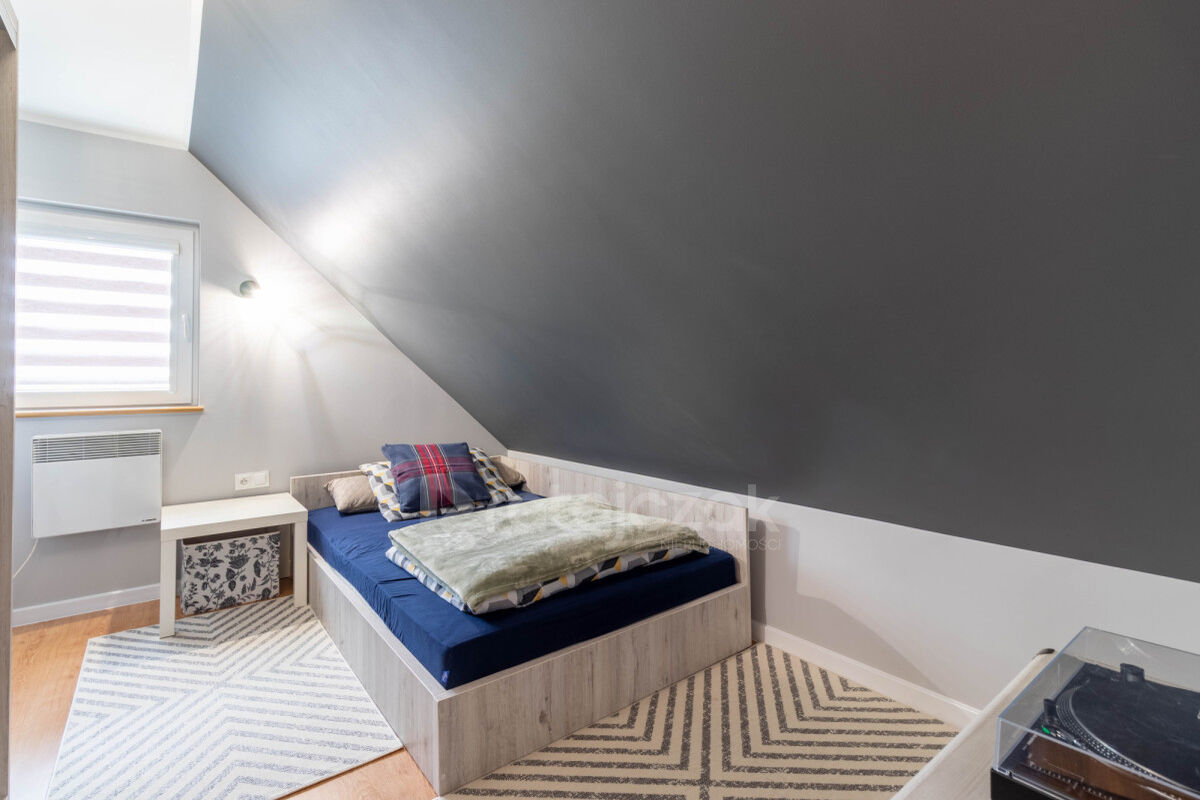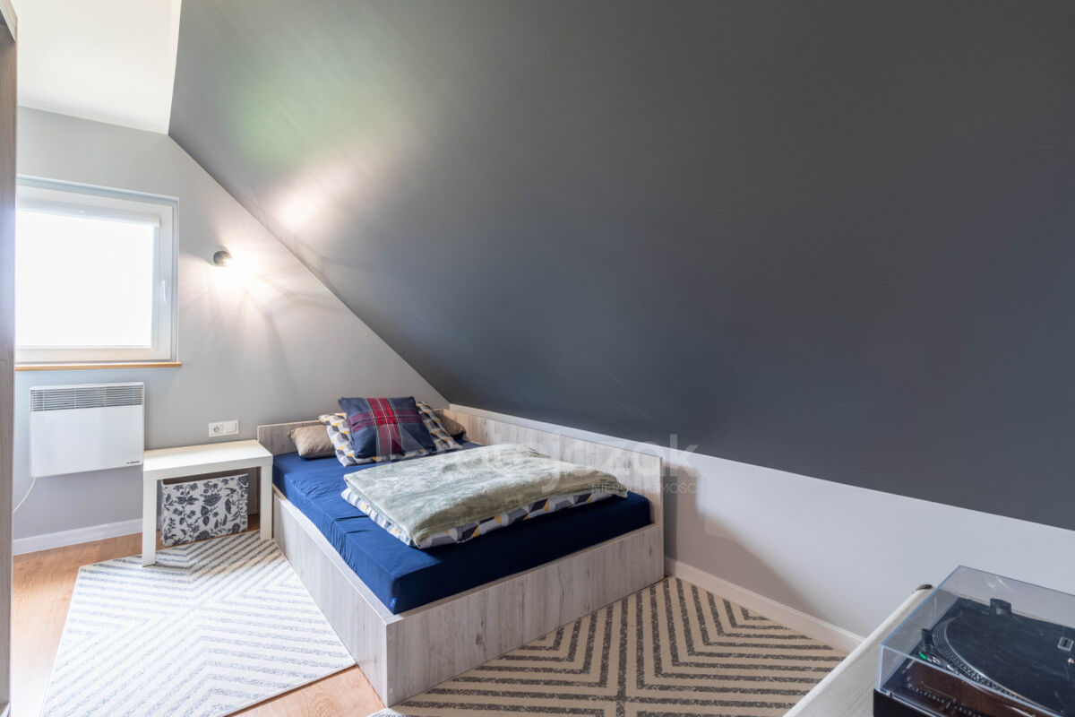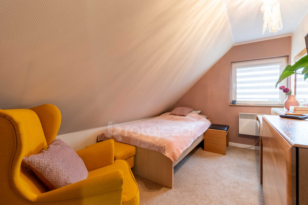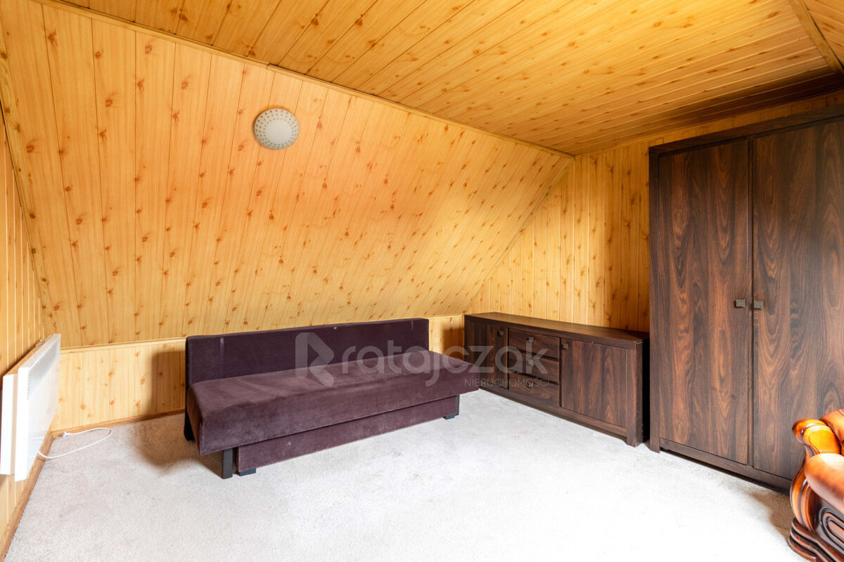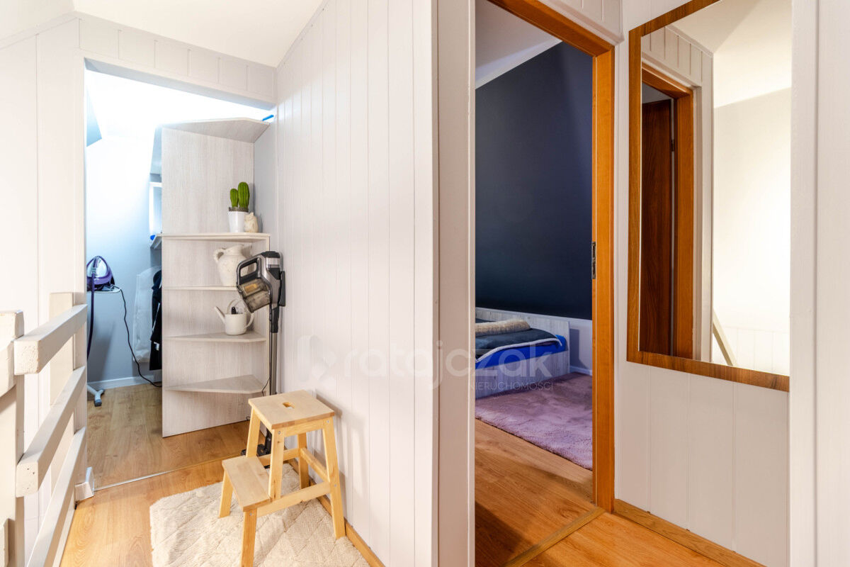 Na poddaszu mieszczą się trzy ustawne pokoje, garderoba oraz korytarz.