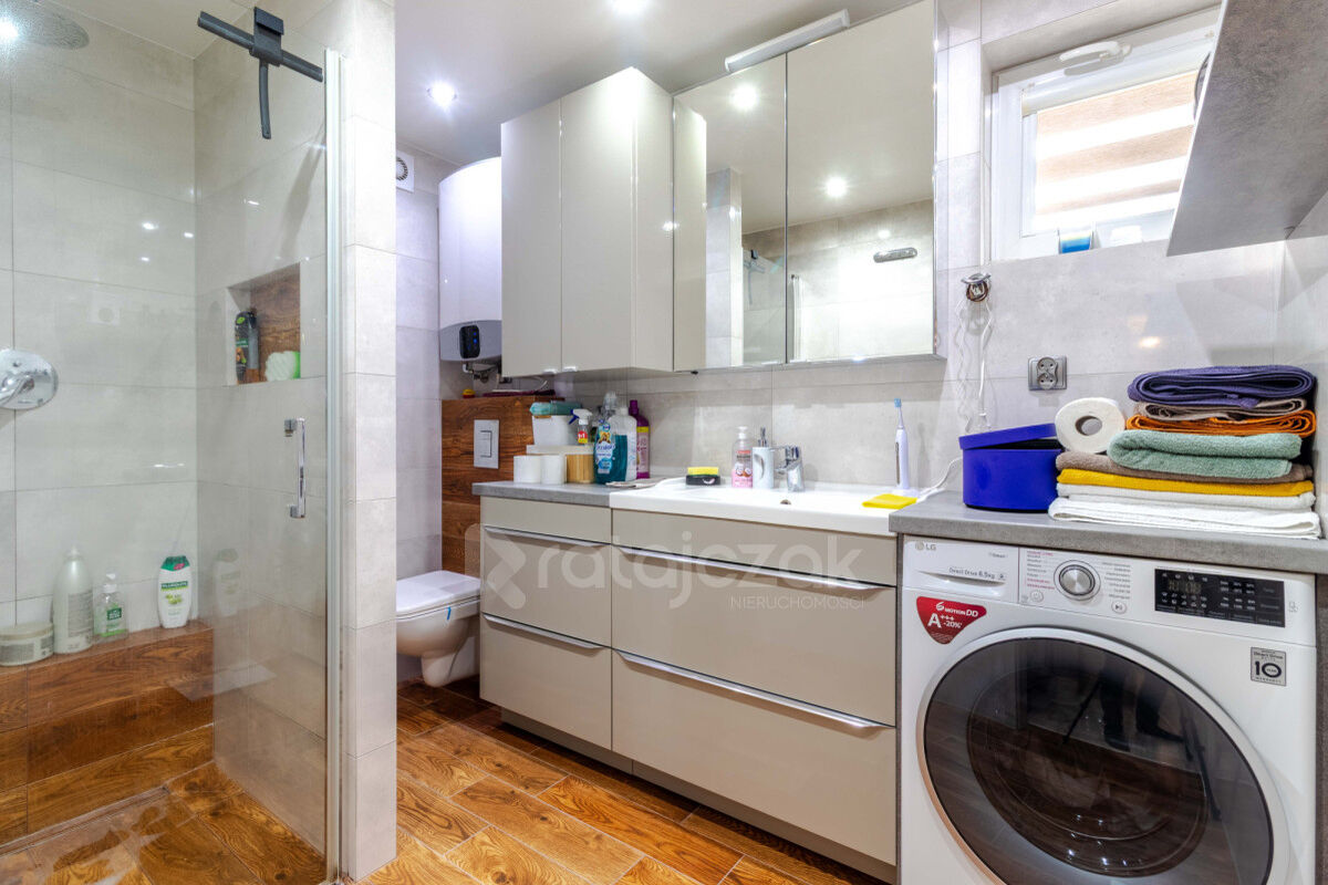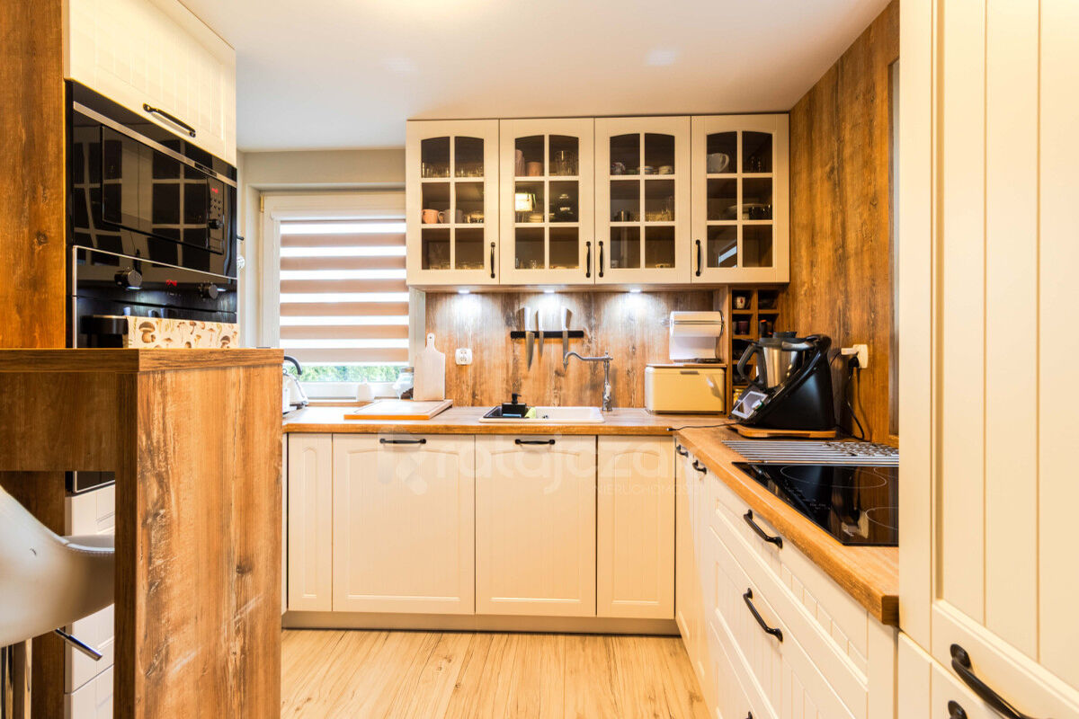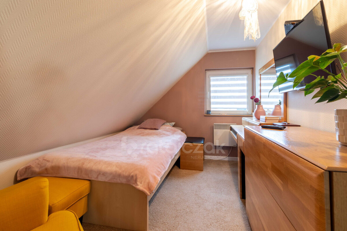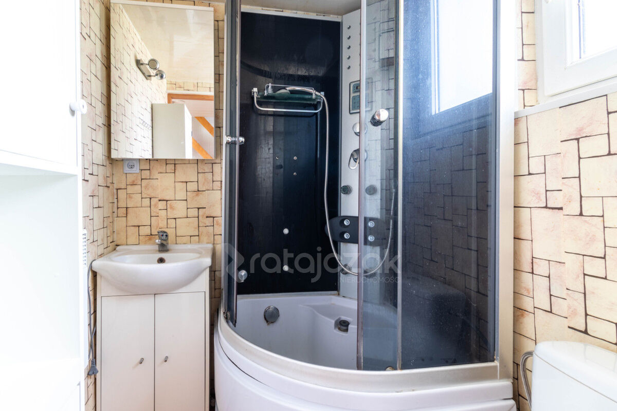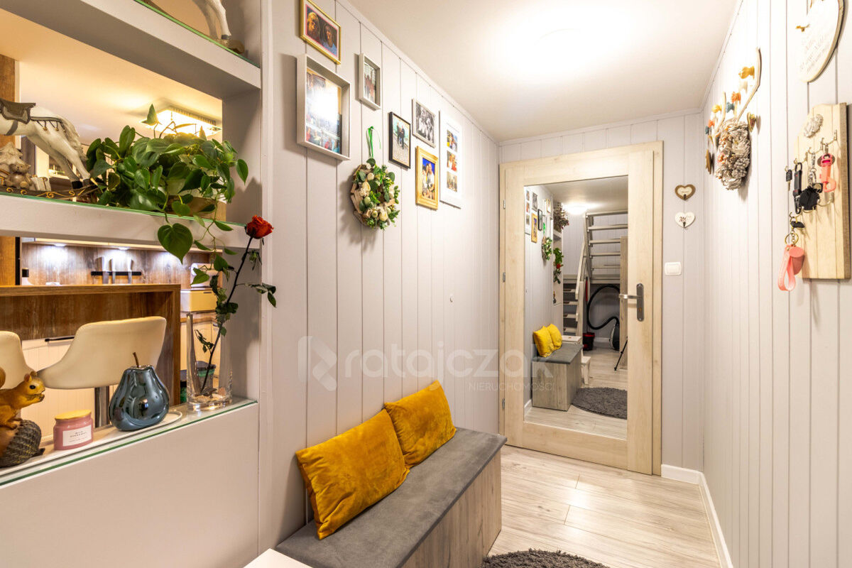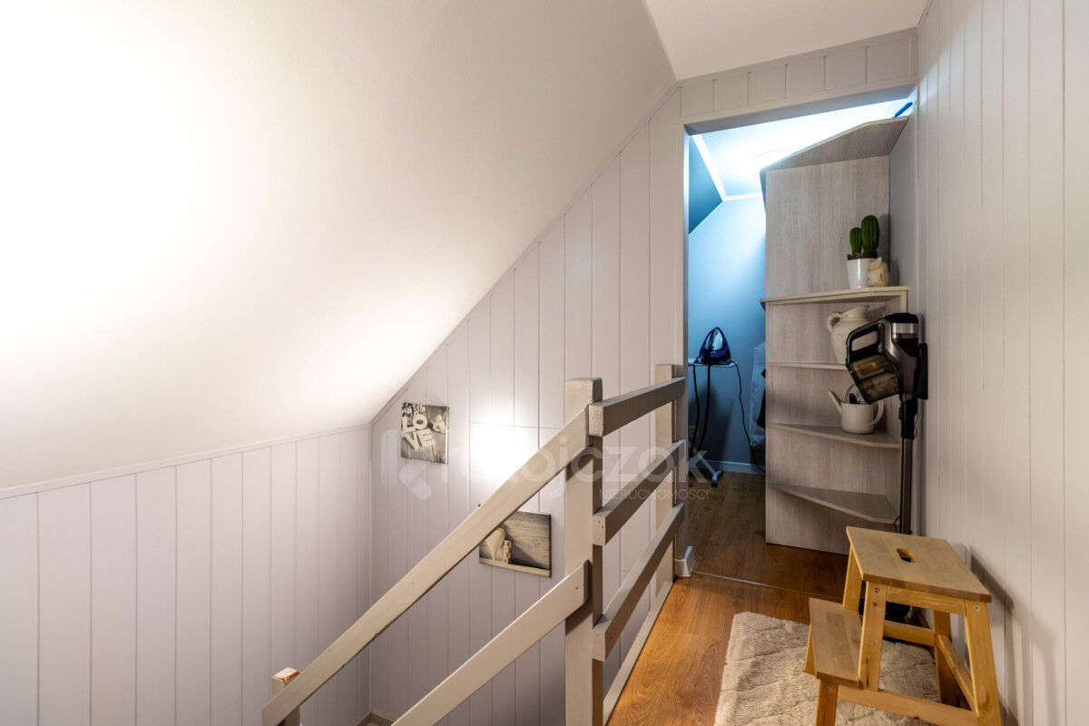 Na parterze znajduje się wiatrołap, korytarz, kuchnia, łazienka po remoncie oraz salon z kominkiem typu „koza”, który nadaje wnętrzu przyjemny klimat.