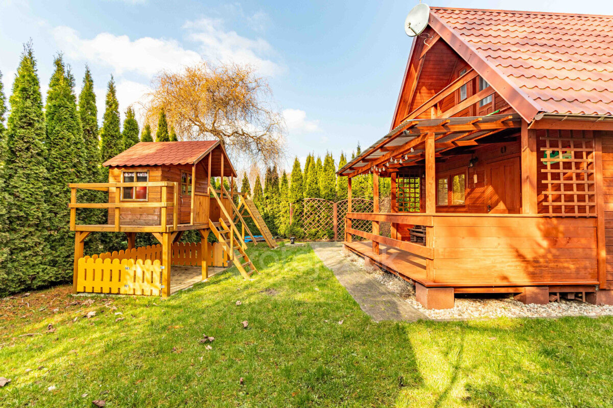 - Drewniany domek dla dzieci, idealny do zabawy na świeżym powietrzu.