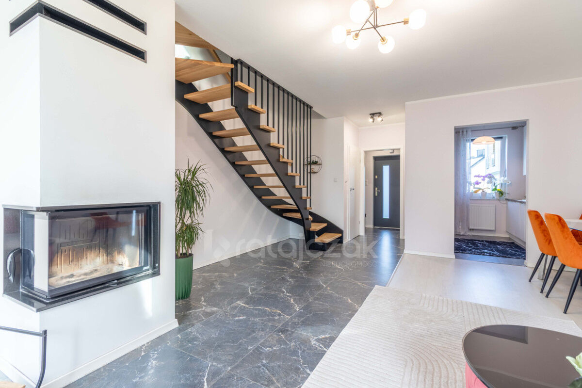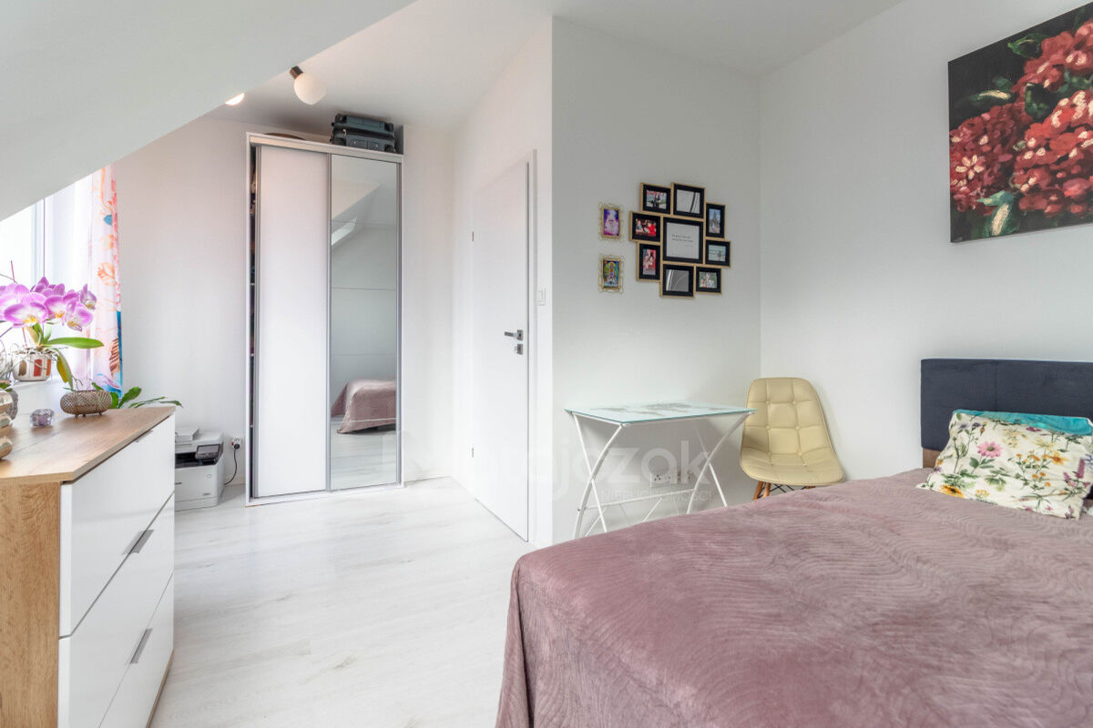 MIESZKANIE: Nieruchomość składa się z, PARTER: - salonu z jadalnią z wyjściem na ogródek z ekspozycją zachodnią, w salonie znajduje się kominek z rozprowadzeniem ciepła również na piętro, - oddzielnej kuchni z meblami i sprzętem w zabudowie, - WC/ pomieszczenia gospodarczego, - wiatrołapu, PODDASZE: - sypialni, - łazienki z dużym prysznicem typu walk-in, - sypialni, - przedpokoju.