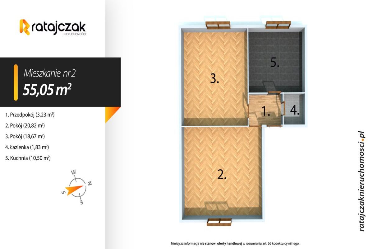 2 niezależnych pokoi (20,82m2, 18,67m2), kuchni 10,50m2, łazienki 1,83m2, korytarza 3,23m2.