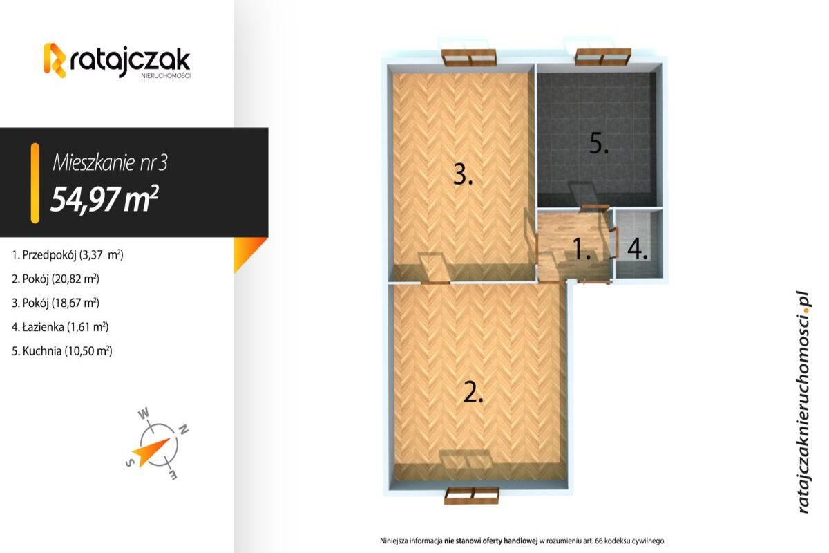 2 niezależnych pokoi (20,82m2, 18,67m2), kuchni 10,50m2, łazienki 1,61m2, korytarza 3,37m2.