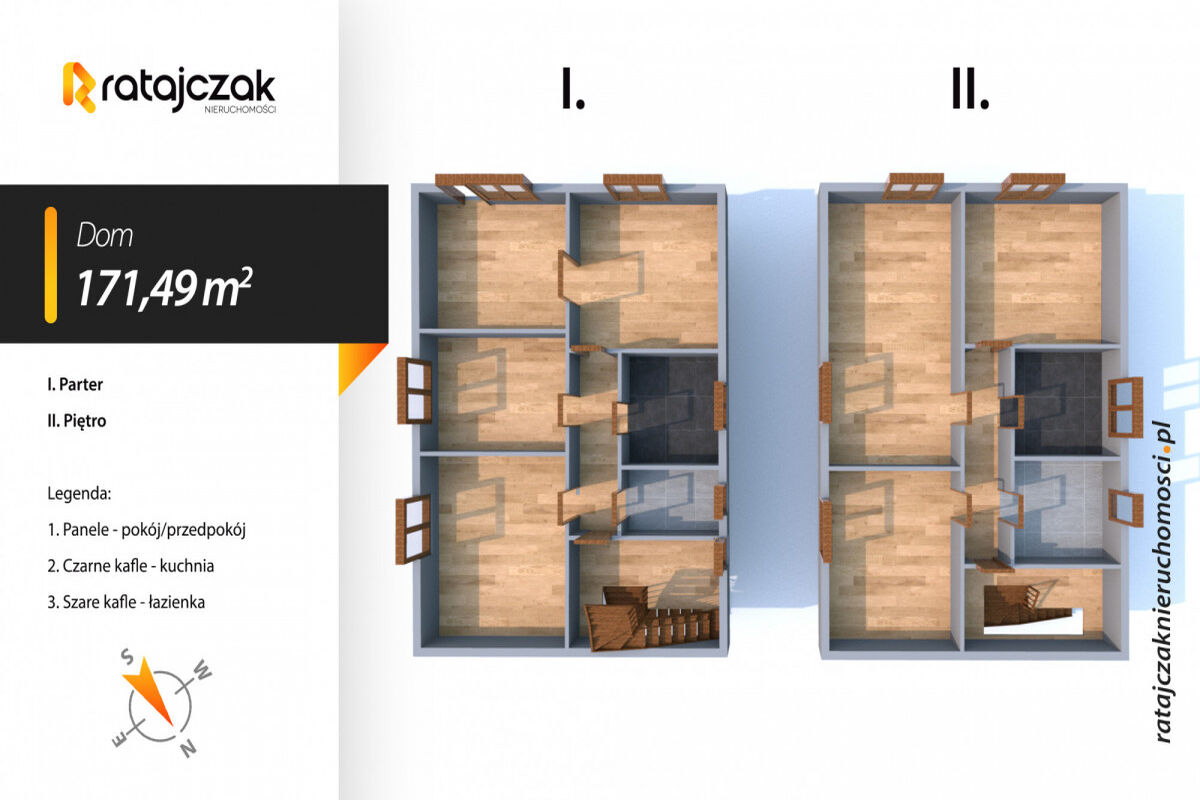Powierzchnia działki to 531 m2, pełna własność. Powierzchnia parteru 85,23 m2 Powierzchnia pierwszego piętra 86,26 m2 Powierzchnia użytkowa bez uwzględnienia klatki schodowej oraz piwnicy i garażu wynosi 171,49 m2, Powierzchnia całkowita wynosi 265 m2 Do powierzchni domu zaliczamy jeszcze klatkę schodową oraz piwnicę.