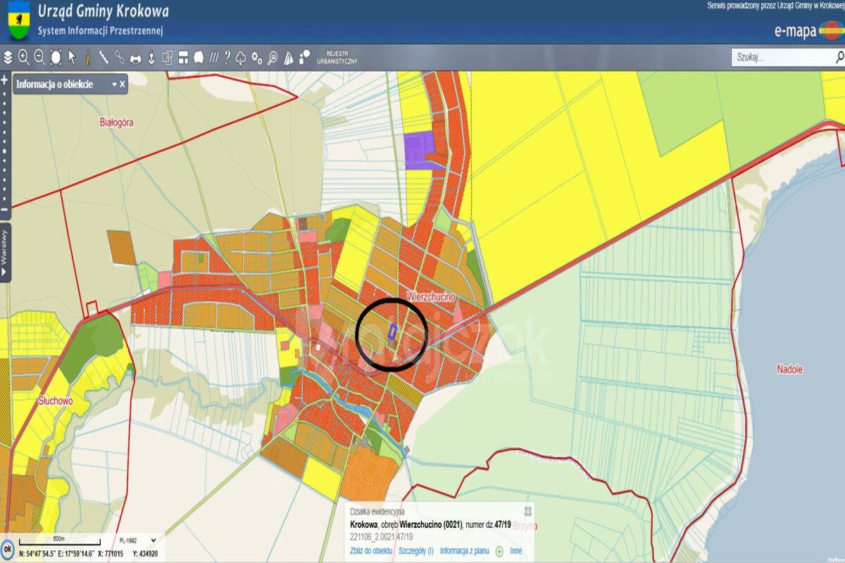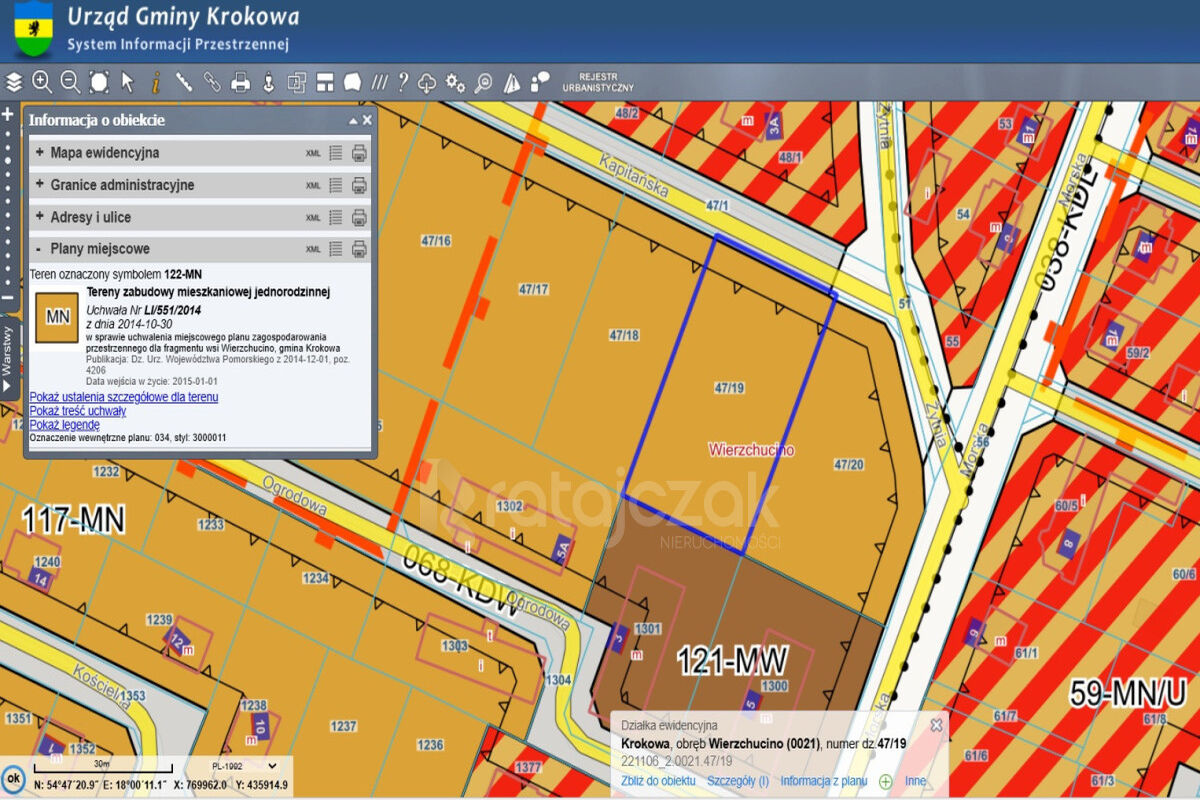 Numer działki 47/19 (221106_2.0021.47/19) w miejscowości Wierzchucino ul. Kapitańska. Wierzchucino to wieś kaszubska w Polsce, w województwie pomorskim, w powiecie puckim, w gminie Krokowa, nad Morzem Bałtyckim, na obszarze Wysoczyzny Żarnowieckiej. Miejscowość ta słynie z bliskości jeziora Żarnowieckiego oraz morza, malowniczych wydm, wyjątkowych widoków, szerokich, uważanych za najpiękniejsze w Polsce czystych nieprzeludnionych plaż, dziewiczych lasów pełnych jagód i grzybów, bliskości przyrody oraz szybko rozwijającej się infrastruktury turystycznej.