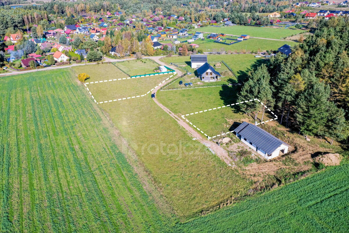 Działka 16/36 o powierzchni 1108 m² graniczy z lasem, co zapewnia prywatność i brak zabudowy za działką. Teren jest lekko pochyły w kierunku drogi.