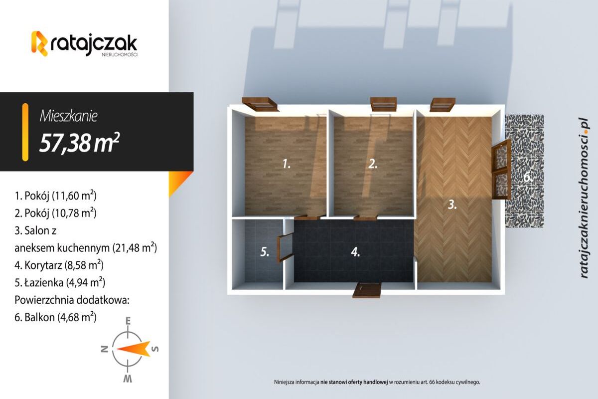 - jasny salon z aneksem kuchennym - 21,48 m²