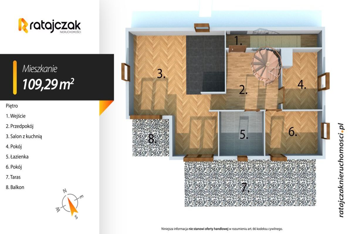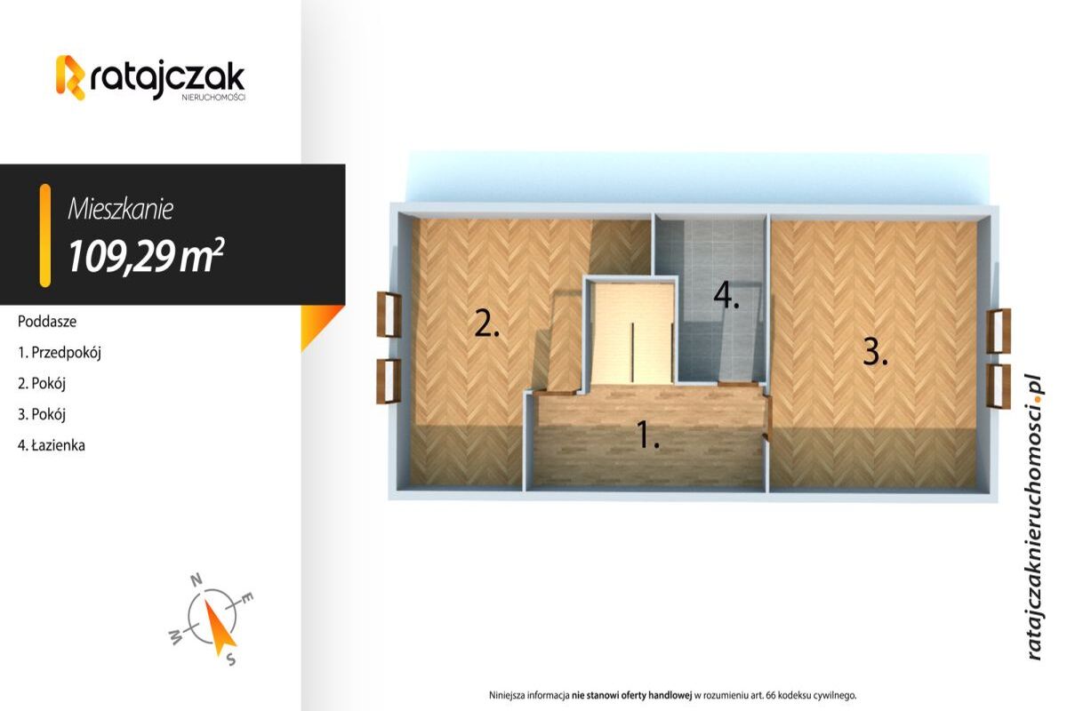Mieszkanie o łącznej powierzchni 109,29 m² składa się z dwóch poziomów, co zapewnia wygodny podział przestrzeni i komfort codziennego życia.