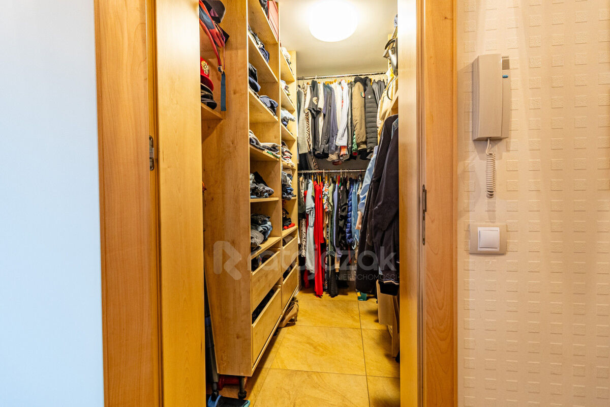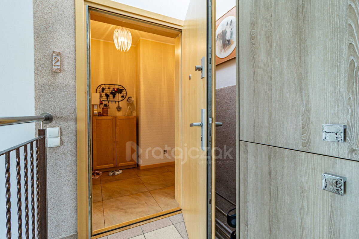 Klatka schodowa zabezpieczona domofonem, świetlik zapewnia dodatkowe przyjemne doświetlenie przed wejściem do apartamentu. Regał biblioteczny na półpiętrze oraz przestronne szafy wnękowe na piętrze, spełniają rolę przechowalni butów, ubrań sezonowych, sprzętu AGD.