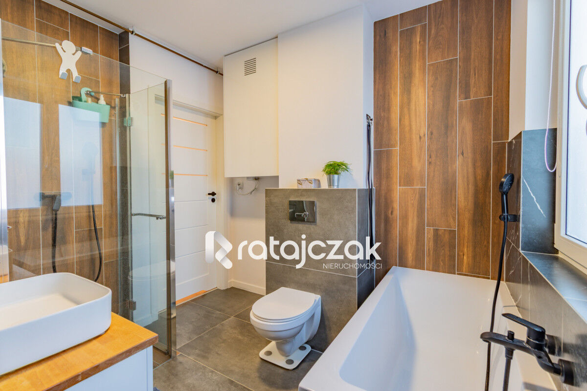 Do mieszkania wchodzisz osobnym wejściem na klatkę schodową którą masz na wyłączność (pod schodami szafki do przechowywania i miejsce na wózek, rowery). W klatce kafelki, beton ozdobny i drewniane schody jesionowe z poręczą. W łazience kafle i płytki wielkoformatowe. W salonie oraz pokojach