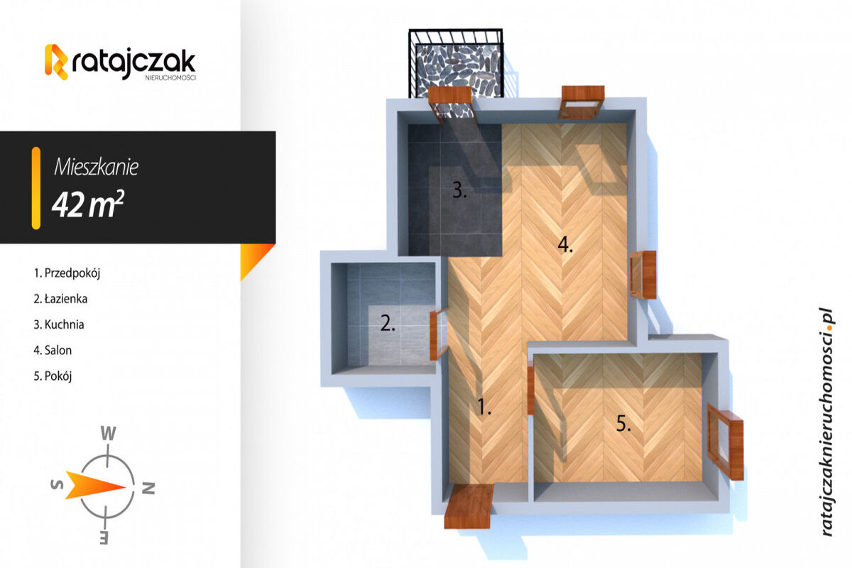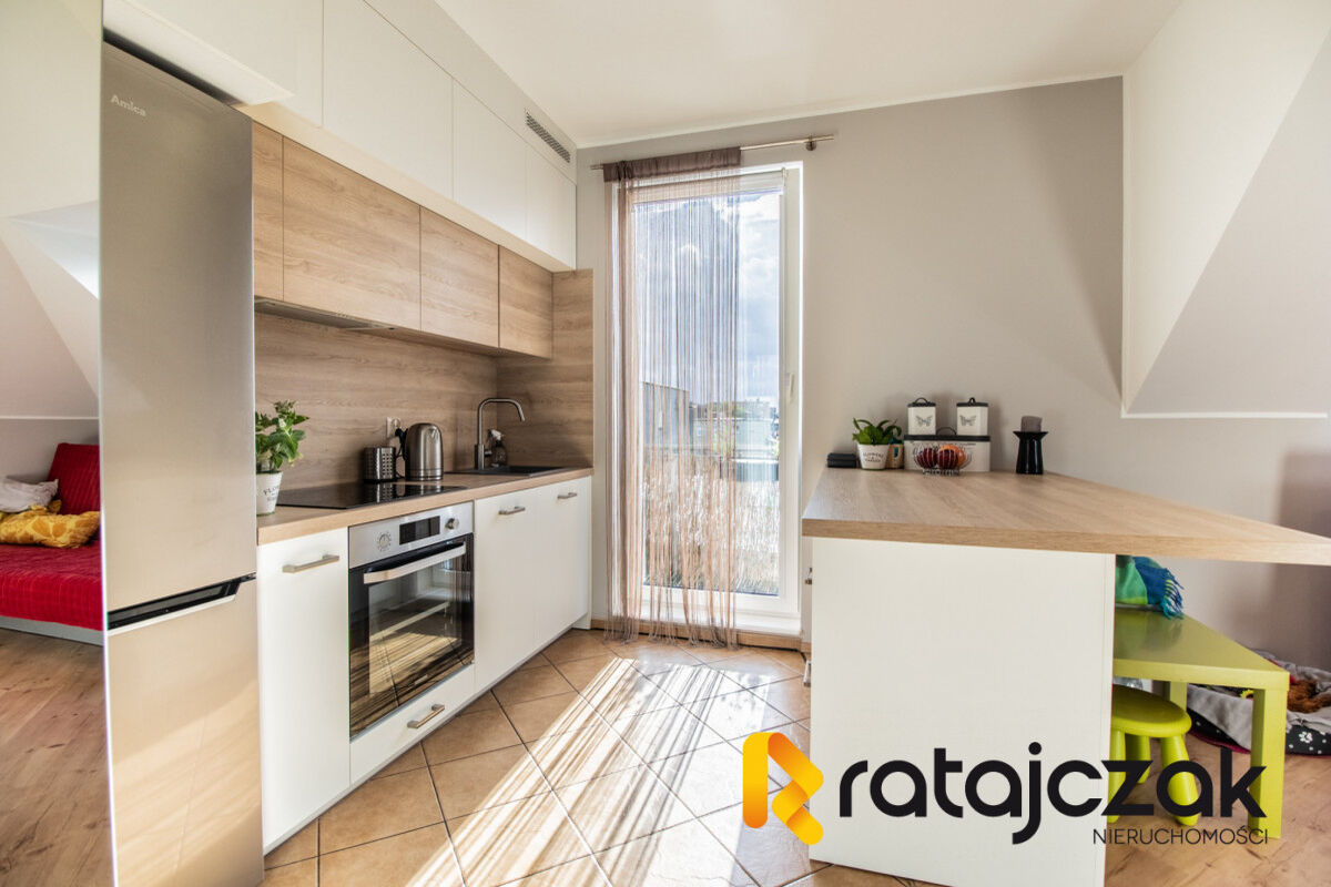 Mieszkanie w stanie bardzo dobrym, dwustronne (płn-zach). Lokal o powierzchni całkowitej 42m2, natomiast użytkowej 37,7m2, w którego skład wchodzą: - salon z aneksem kuchennym 17,4m2 - pokój 10,1m2 - łazienka 4m2 - korytarz 5,5m2 - balkon 3m2