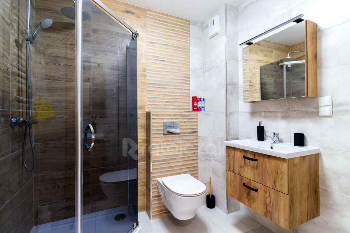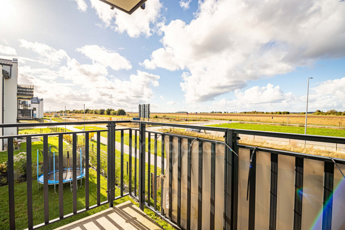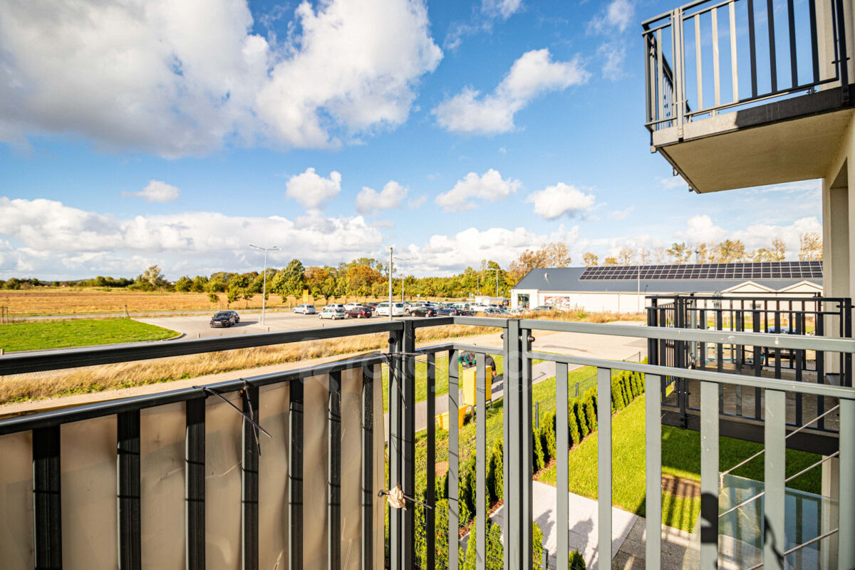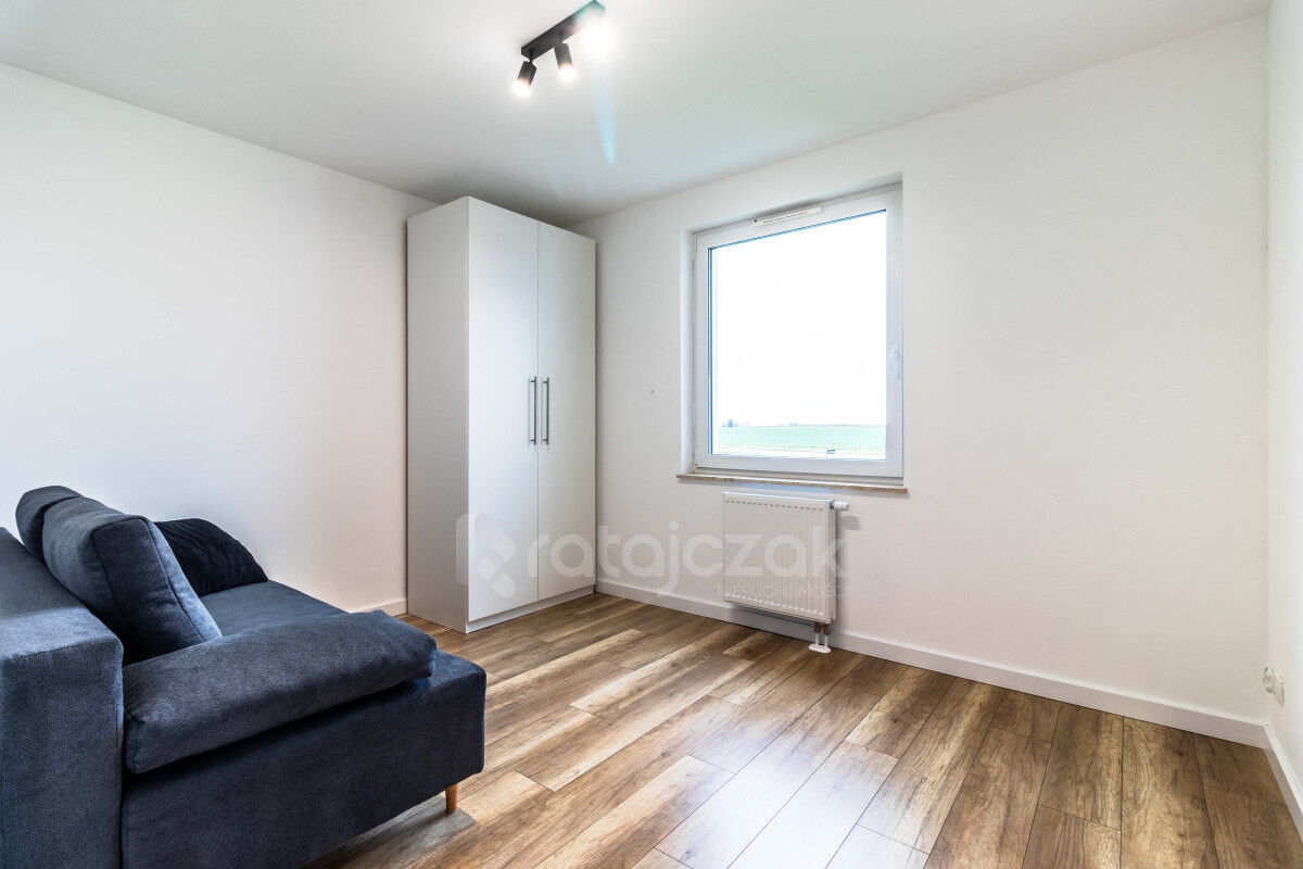 Okna w mieszkanie usytuowane są od strony północno-zachodniej, z widokiem na drogę, a za nim na duże pole. Układ mieszkania jest bardzo atrakcyjny, za sprawą dużego salonu oraz ustawnych pokoi, które można łatwo umeblować wedle uznania. Mieszkanie jest wykończone w odcieniach szarości, bieli oraz drewna, co sprawia, że jest jasne i przestronne. Całe wyposażenie widoczne na zdjęciach jest oczywiście zawarte w cenie sprzedaży.