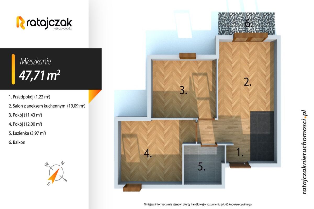 Mieszkanie o łącznej powierzchni 47,71 m2 składa się z: